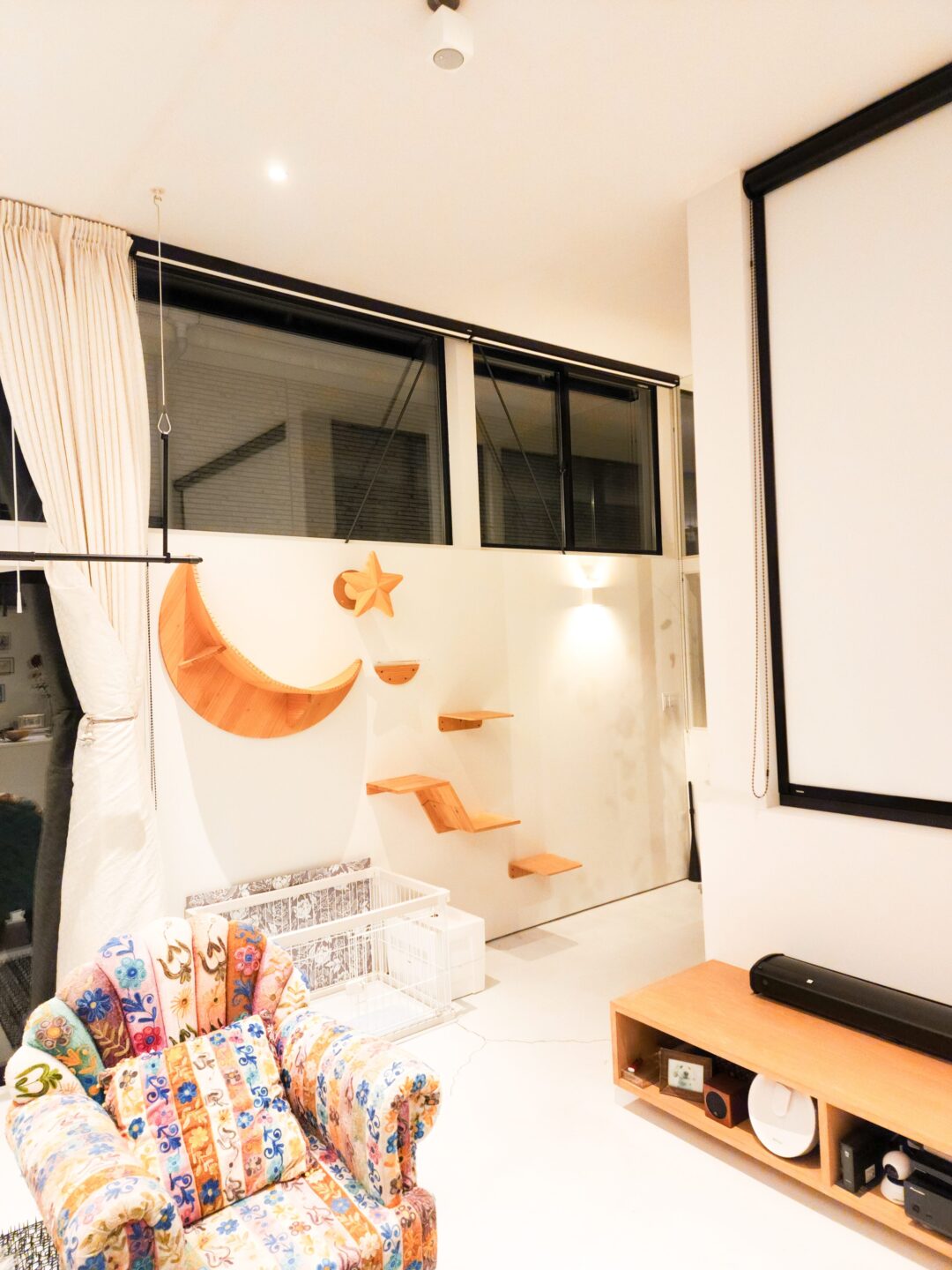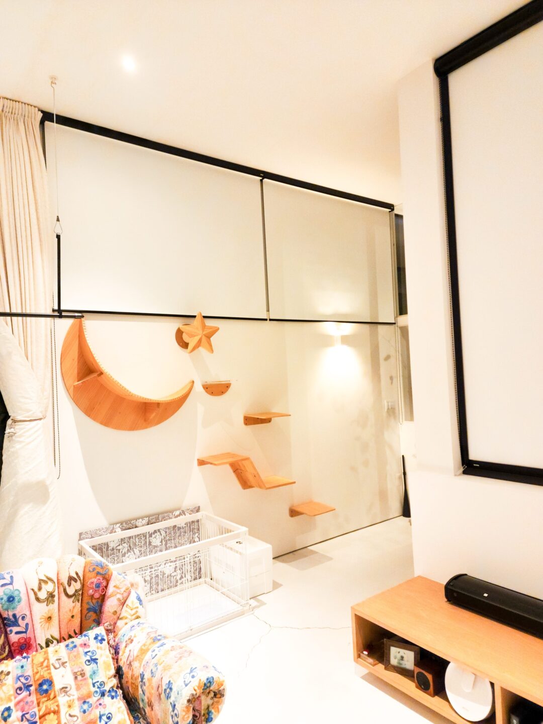 天井高さ3.4mで窓前には作り付けのTVボードがあった為、どのようにして施工するのかかなり悩みました。