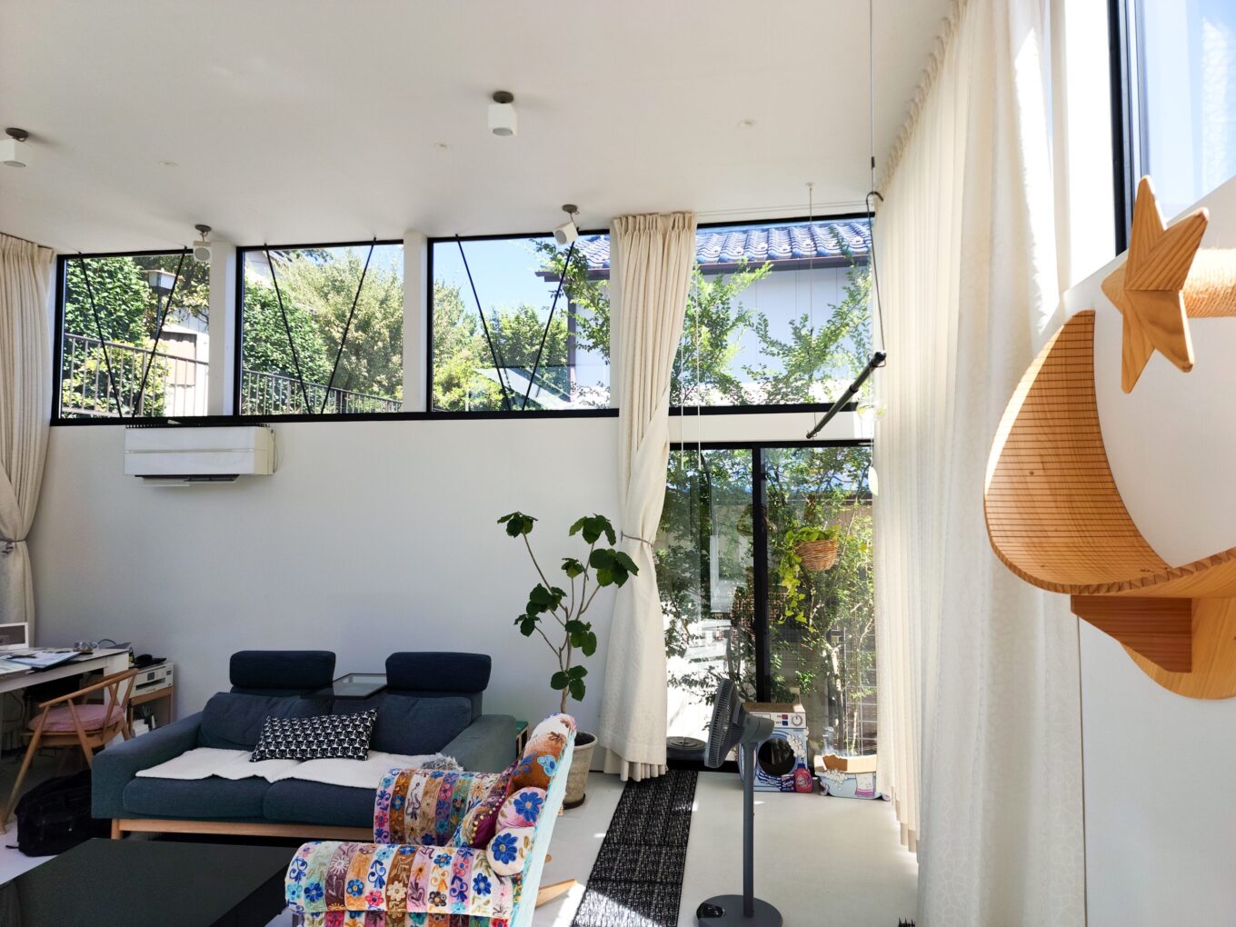 窓に囲まれたお宅でしたので、明るくて開放的ですが、去年あたりから夏は暑くて家の中で過ごせないということと