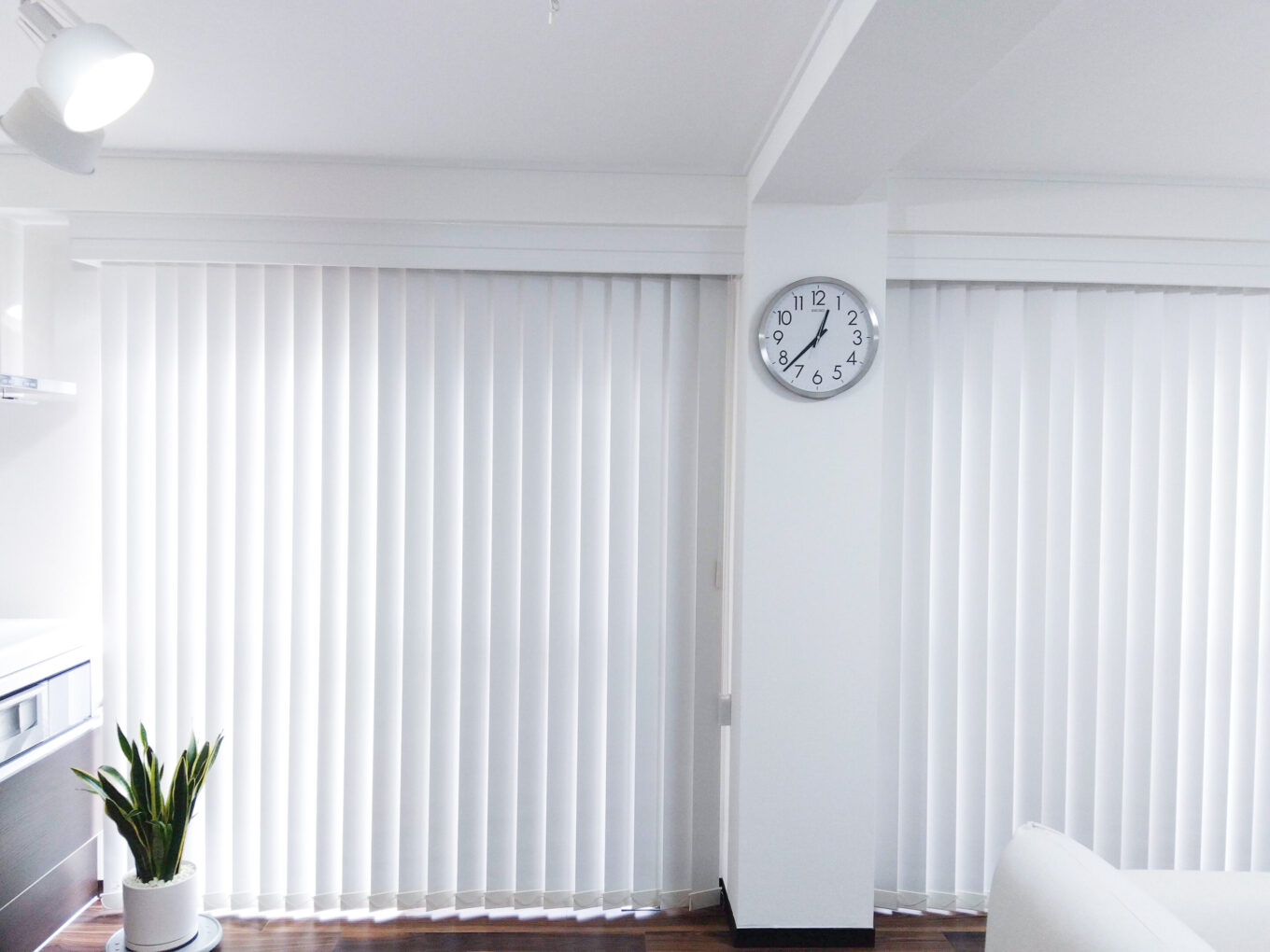 モダンで統一された空間にはスタイリッシュなニチベイのバーチカルブラインドをお仕立てしました。ライトアイボリー色の遮光1級で現代的な性能の合わせ持っています。