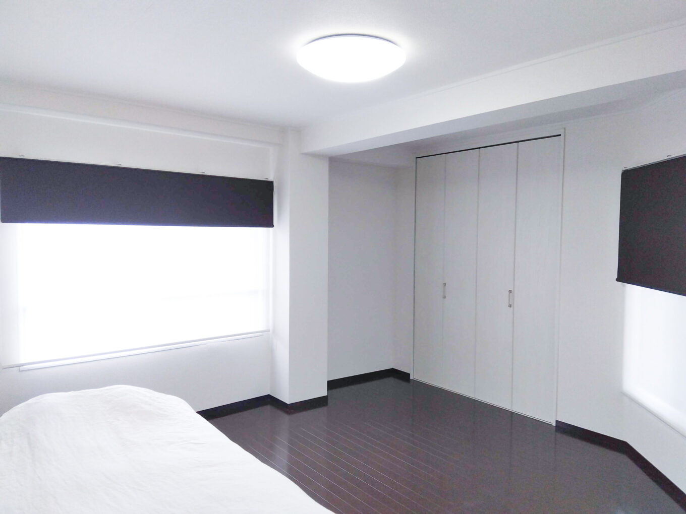 Bedroomには光を遮るロールスクリーンを設置しました。シールド付きなので、隙間からの光が漏れないよう作りに!ロールスクリーンの性能を最大限に発揮した製品となっています。