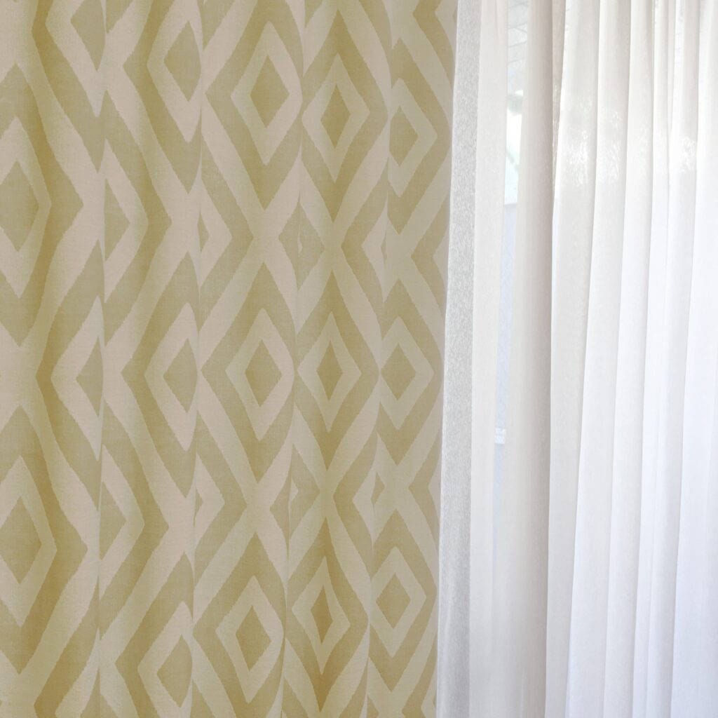 ドレープカーテンの柄は、帯やきものに良く使われる吉祥文様「菱柄」を、エスニックな幾何柄と重ね合わせたデザインです。