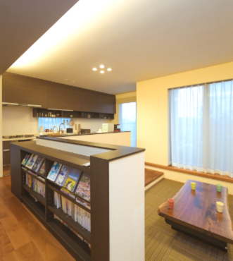 玄関からリビングエリアに入ると、まず目に入るのが間仕切りを兼ねたずっしりと大きな本棚。そしてその奥に一段低い広々としたリビングルーム。