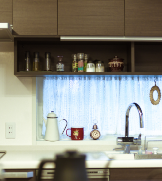 籠やホーローのポットなど、ヨーロピアンカントリー調の小物や、アンティック調でどこかノスタルジーを感じさせる手編み風のレースカーテンを使うことで、とても温かみのあるチャーミングなキッチンスペースに。
