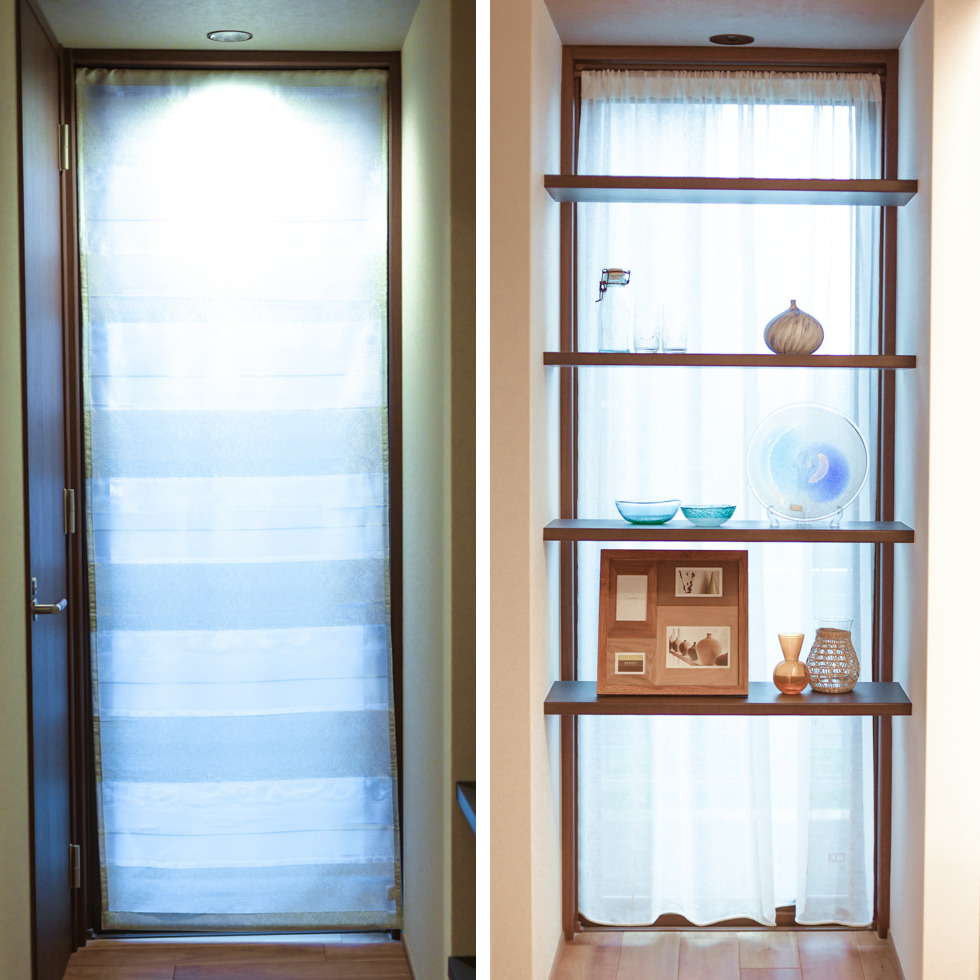 風通織りのボーダーレースを、一枚の絵画のようなフラットカーテンに仕立てることで、スタイリッシュな玄関を創りました。
