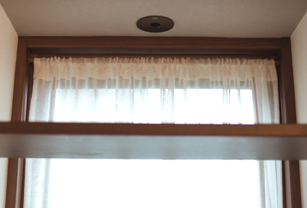 *玄関の正面の窓(写真左) には、巾広ボーダーレースをヒダ無しフラットカーテンに仕立てて、狭く暗くなりがちの玄関を広々と明るいスペースに。