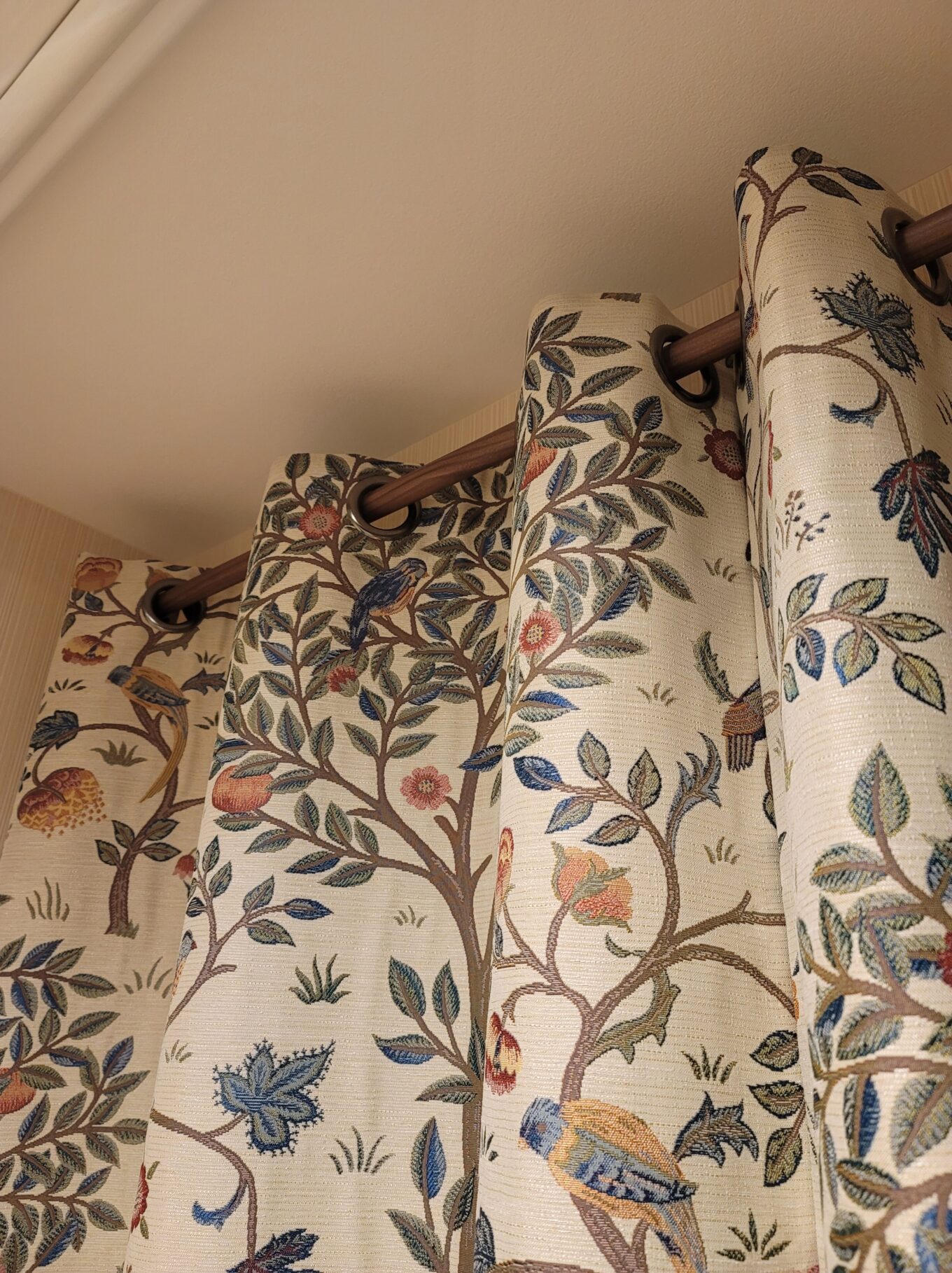 大きな木と鳥が集うケルムスコットの風景が絵画のようにデザインされた美しい刺繍カーテン