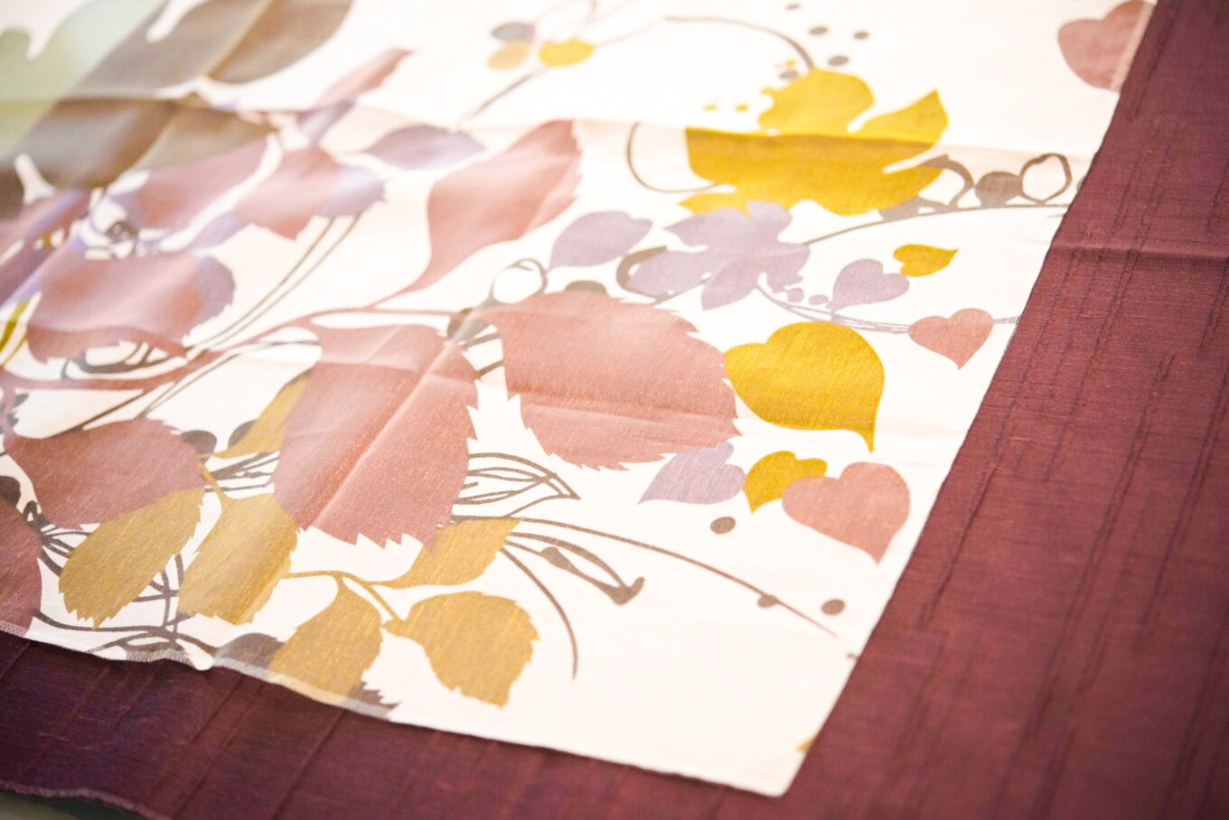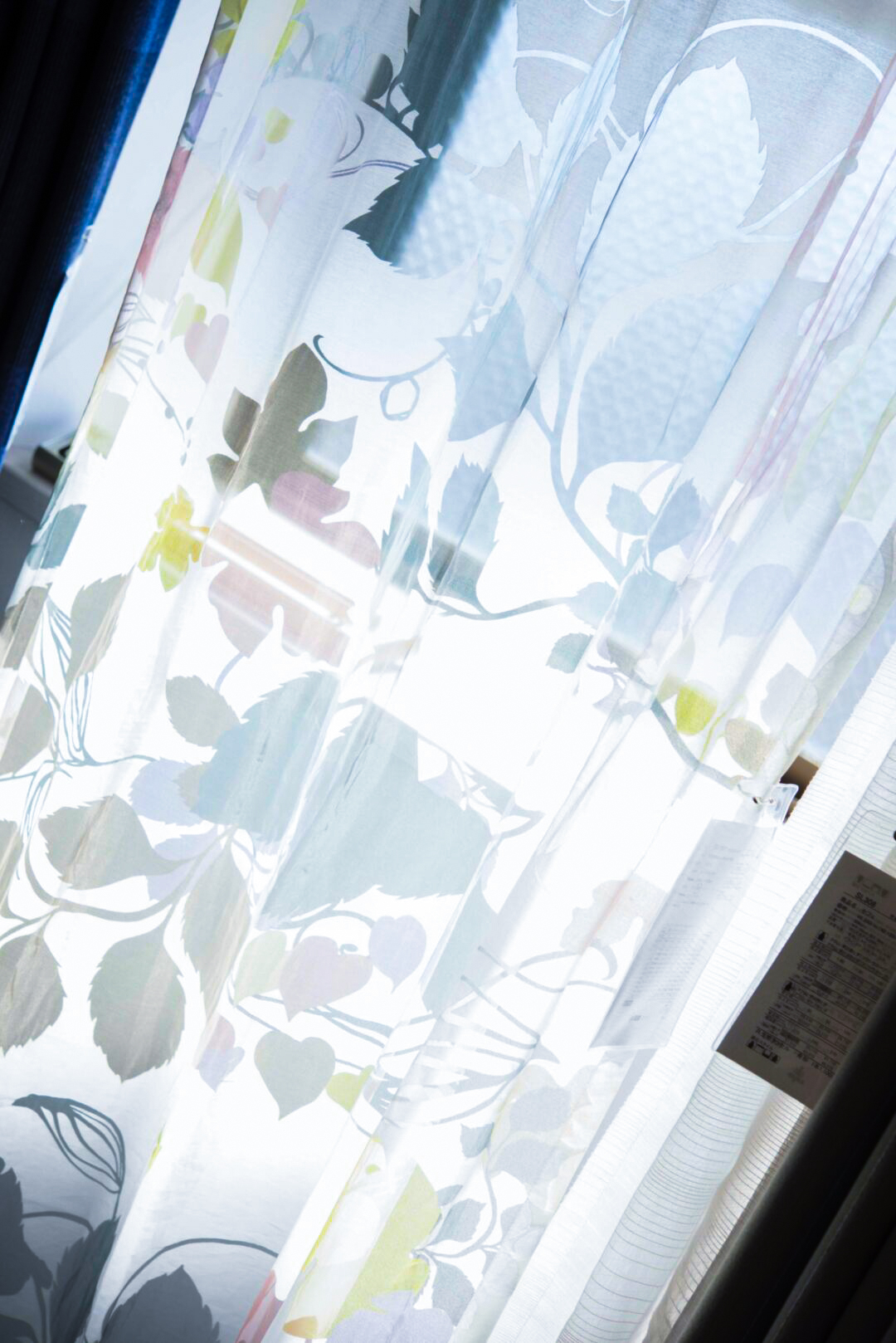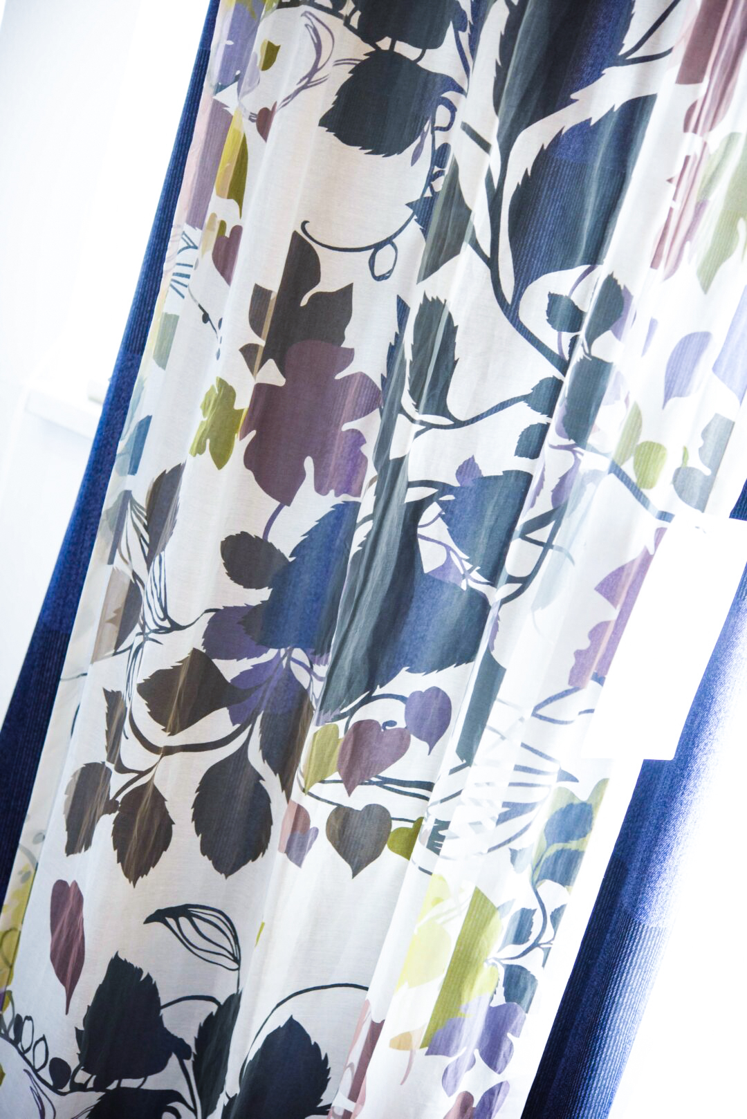 オパール加工にプリントされ、洗練されたデザインのシアーで、可憐なボタニカル柄に日光が当たった時も、夜後ろのカーテンを閉めた時も、どちらも楽しめる素敵な窓辺です。