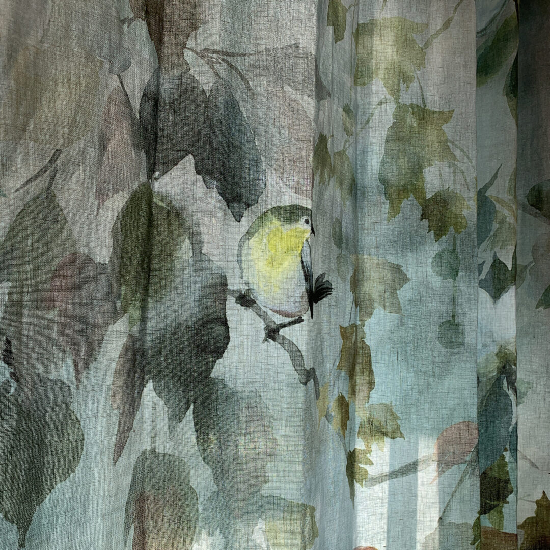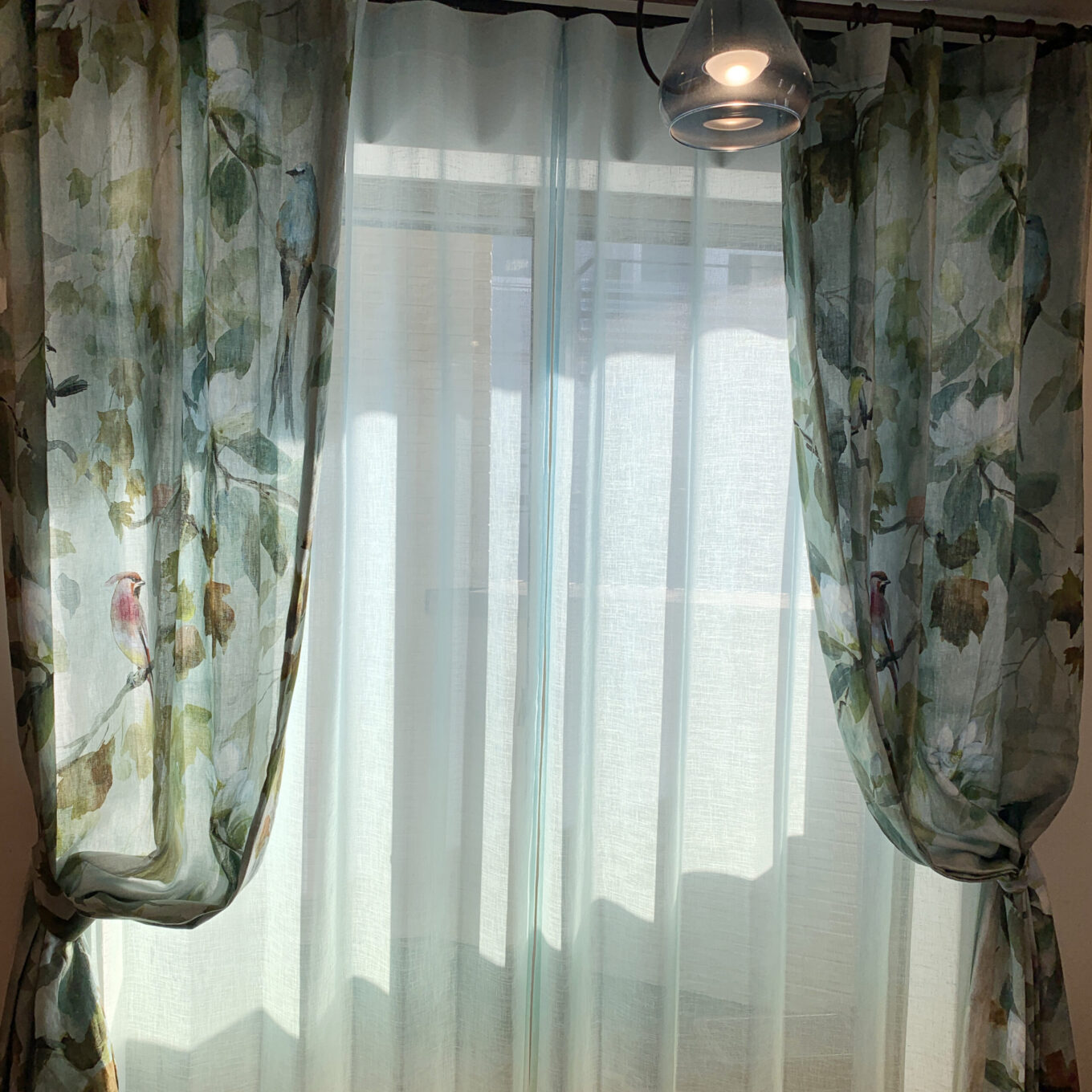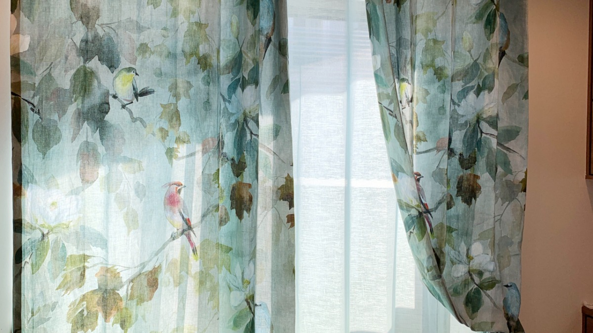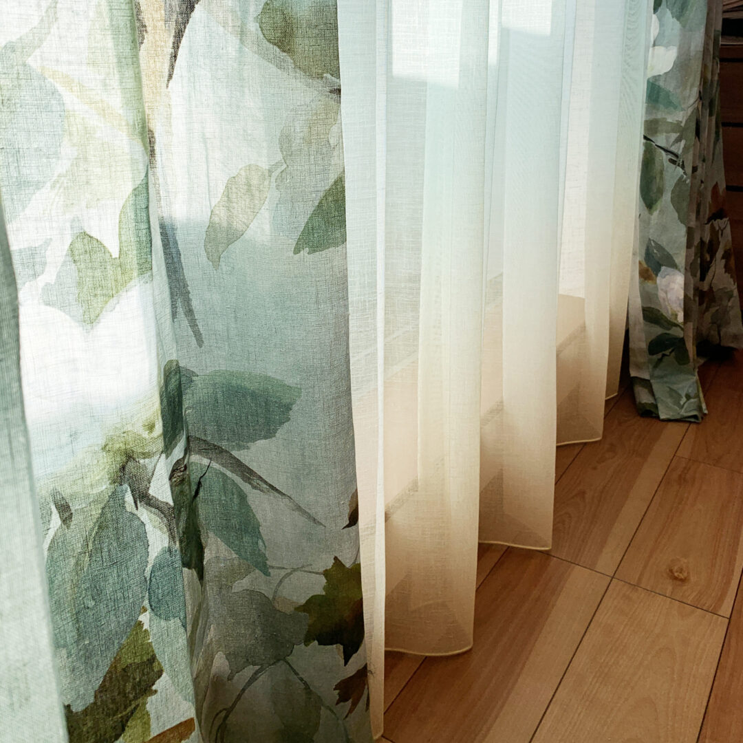 窓装飾プランナーのIです。グラデーションのレースカーテンと、水彩絵具で描かれた小鳥が素敵な天然素材のテキスタイルを組み合わせいたしました。光を程よく通す生地なので、柔らかな優しい光が、ファブリックを通してお部屋の中へ入ってきます。ほっとする、心地よい空間に仕上がりました。