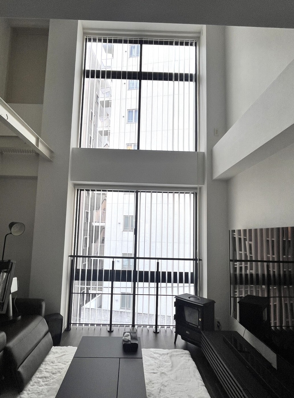 吹き抜けの大きな窓とリビング窓に、バーチカルブラインドをお納めいたしました。