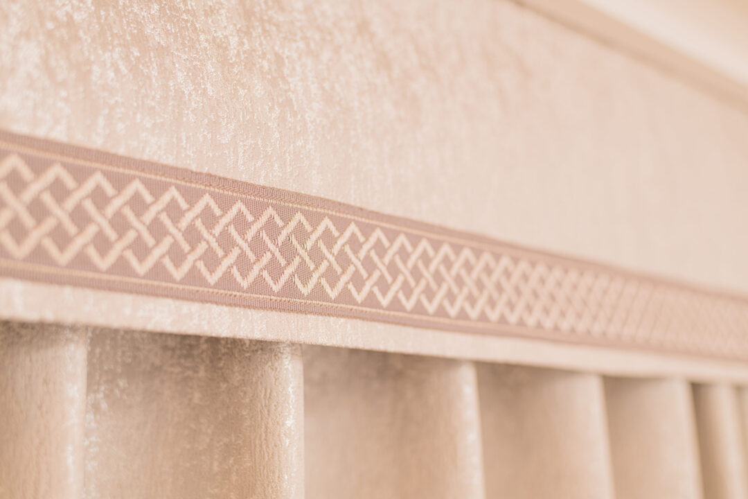 寝室のお部屋には光が漏れて睡眠を妨げないようにバランスを設置しました。四角ダイヤ柄の織りテープ・ボーダーで上質な空間を演出します。