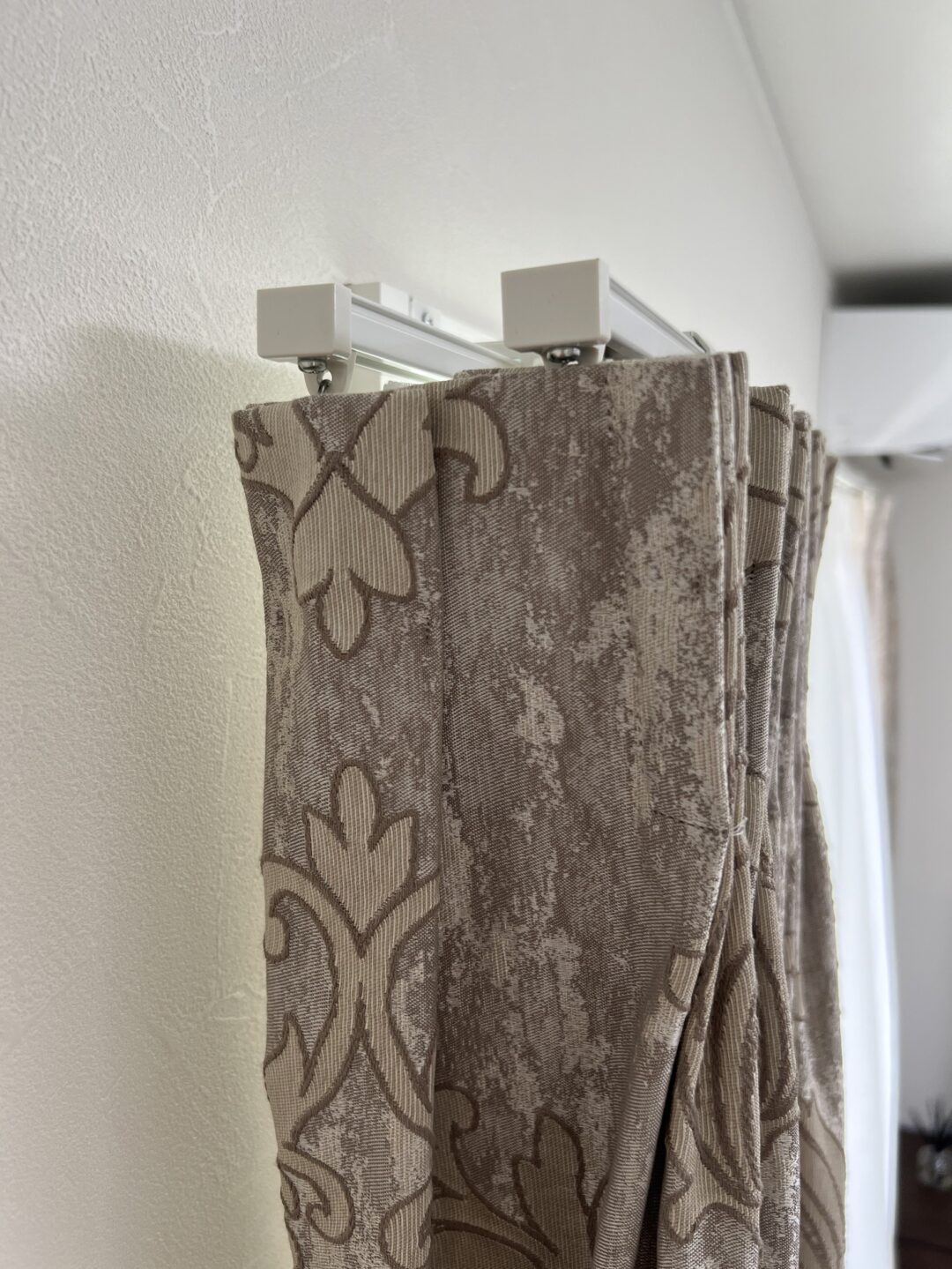 横スリットの窓にも、既存でホワイトのシンプルな機能レールが付いていて、これは短いカーテンでは表現できない生地なので、思い切って長さをたっぷり取りました。