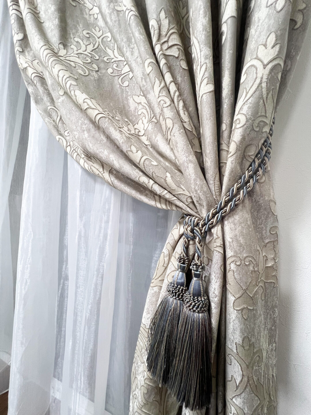 カーテンと共布のクッションと着物の帯の模様を縦糸横糸織り込んだ「帯額」が、お部屋を更にグレードアップ!