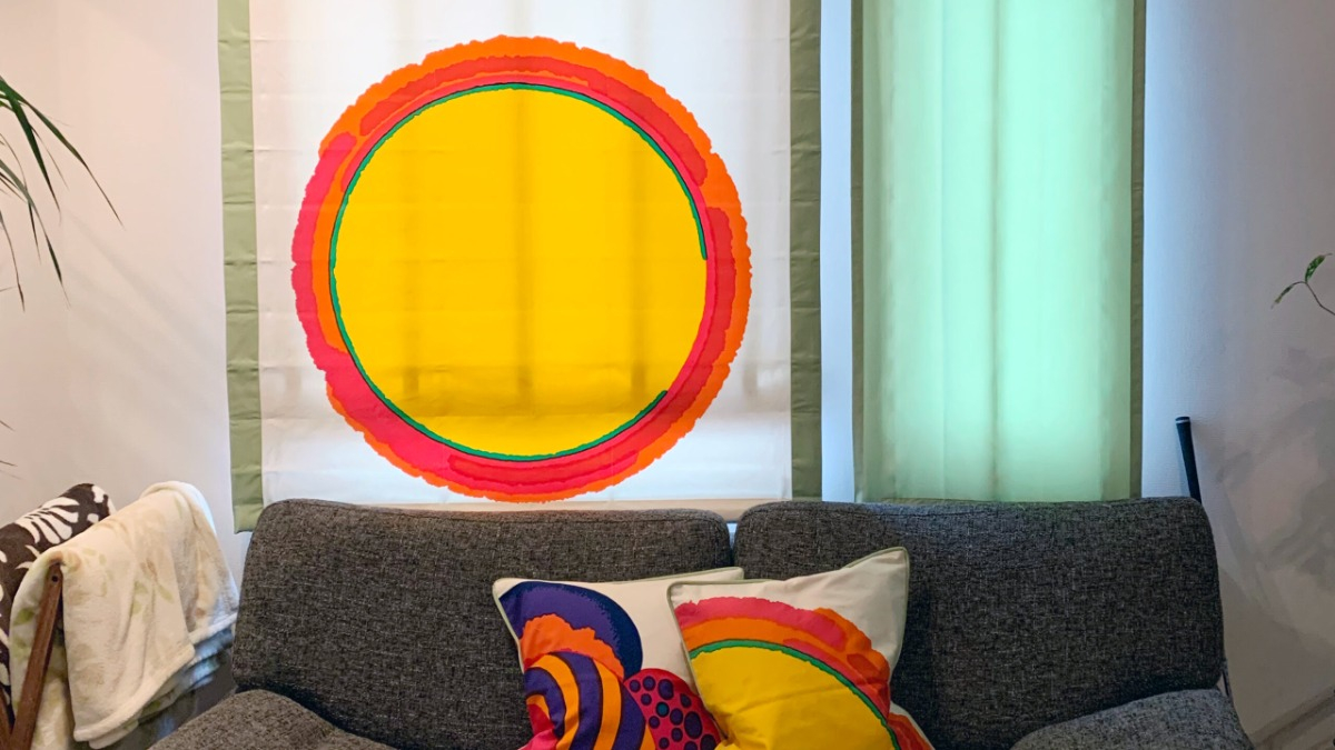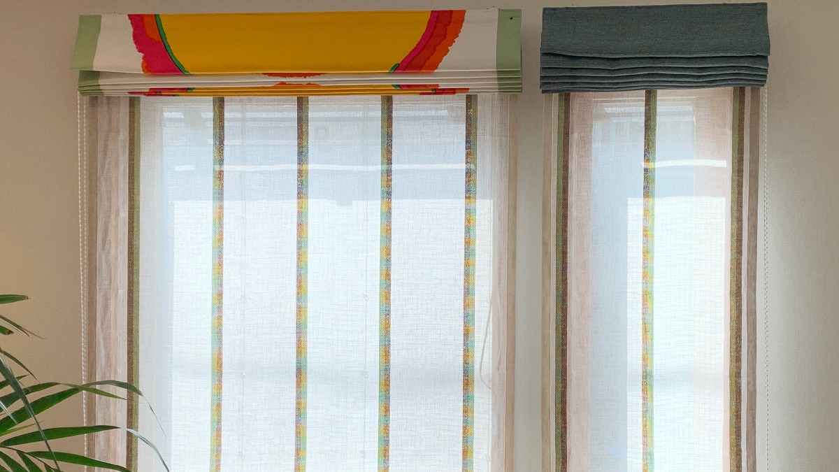 模様が綺麗に出るように、シェードの両サイドはアクセントカラーを入れさせて頂き、お揃いのクッションも製作いたしました。明るい気分になるポップなカラーがとっても魅力的です。