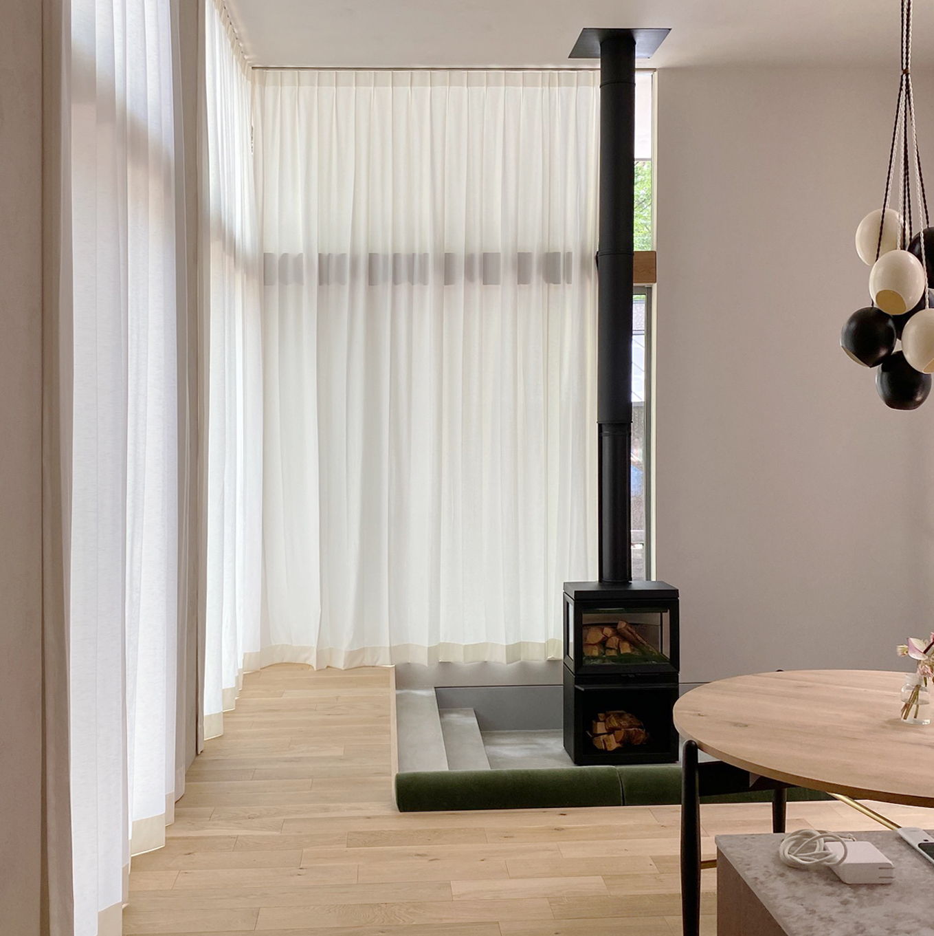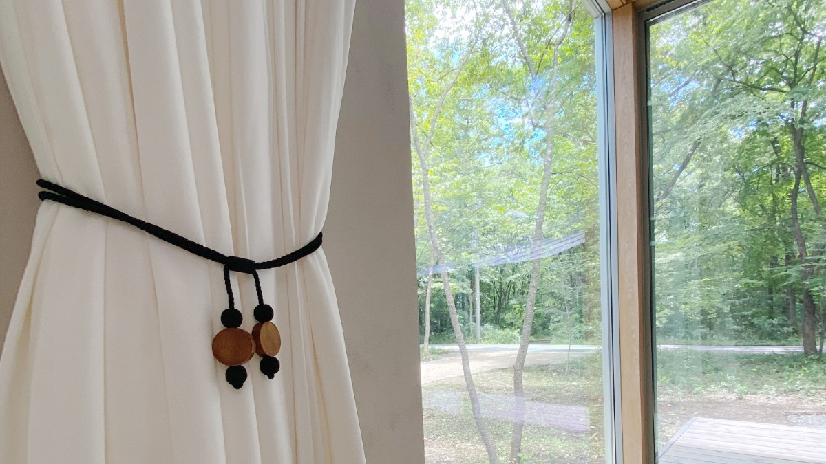 自然素材いっぱいのリビングルームにナチュラル素材のカーテンで安らげる空間に。