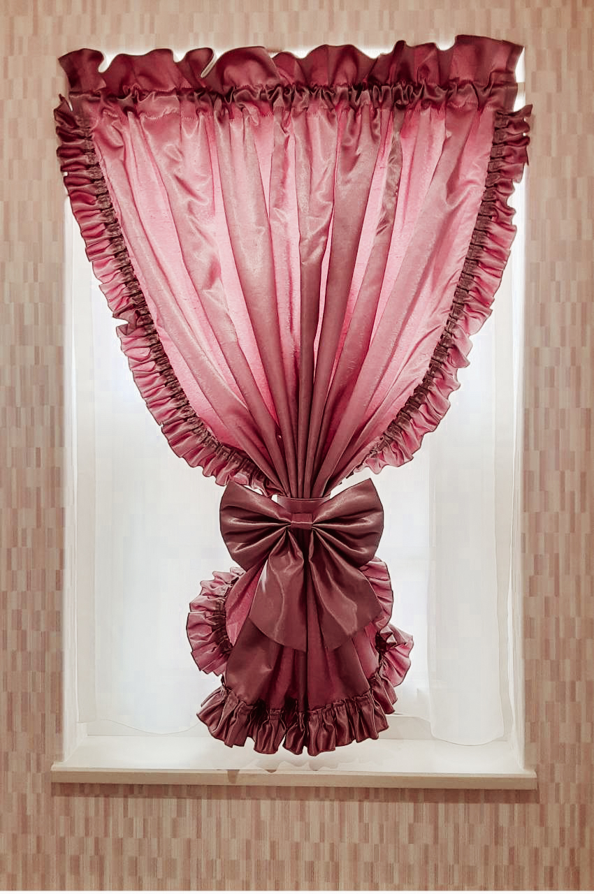 ピンクのバルーンシェードはせっかくの窓のデザインを活かすように裾の刺繍が可愛らしいエバ柄のレースをコーディネートしました。