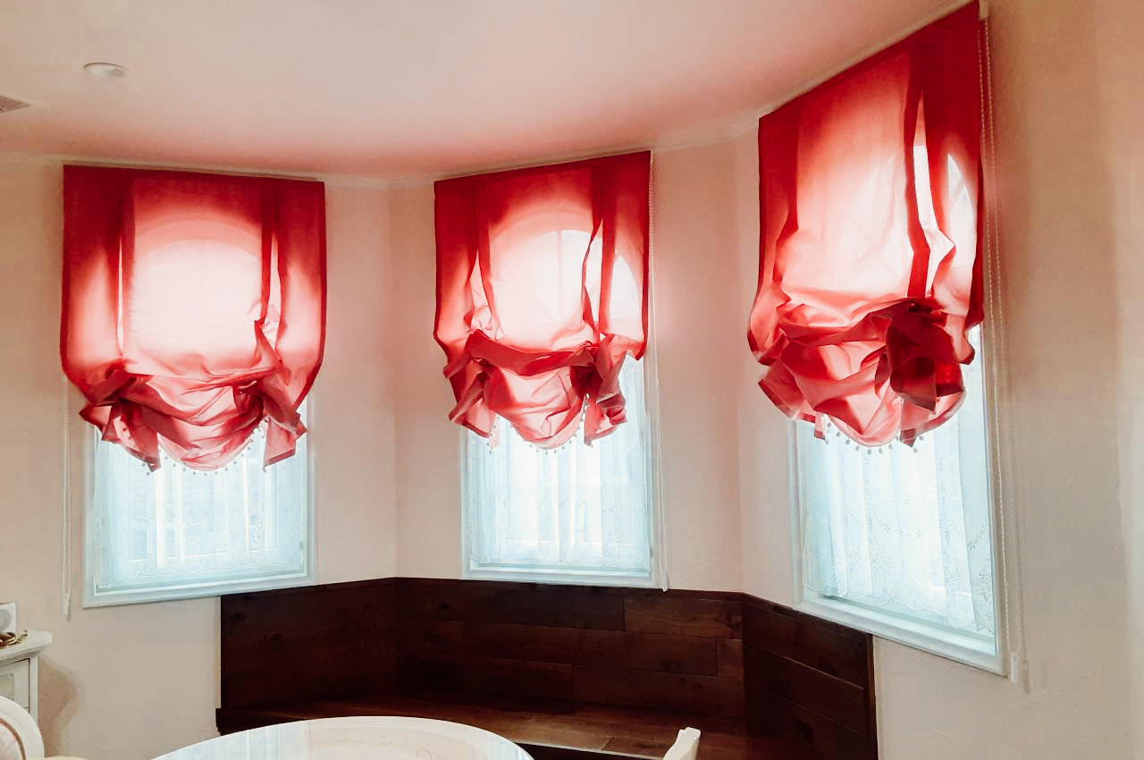 3連の窓と玄関はバルーンシェードにトリムをあしらって可愛らしく仕上げました。