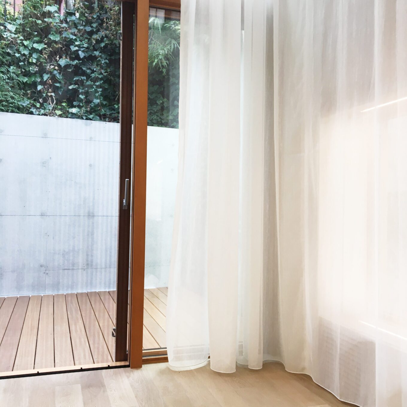 光で輝くレースカーテンを高窓から流れる滝のように仕上げました
