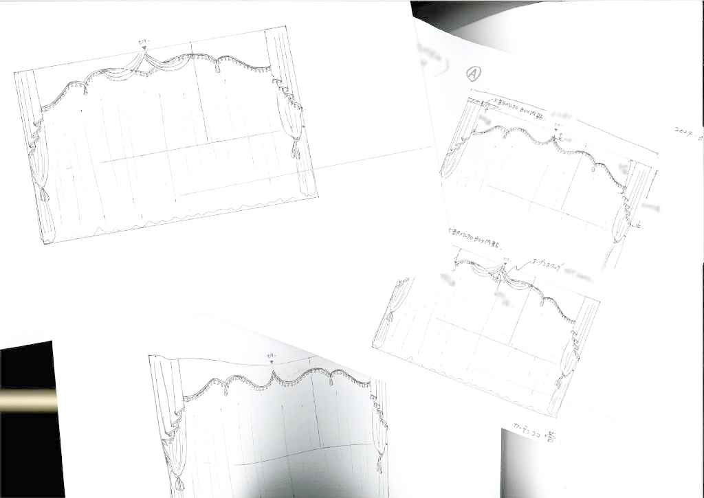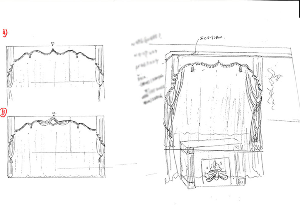 最初はまだリフォーム中で什器等もない窓に、イメージいただきやすいように、生地のサンプルとスケッチで想像していただきながら御見積ご提案を致しました。