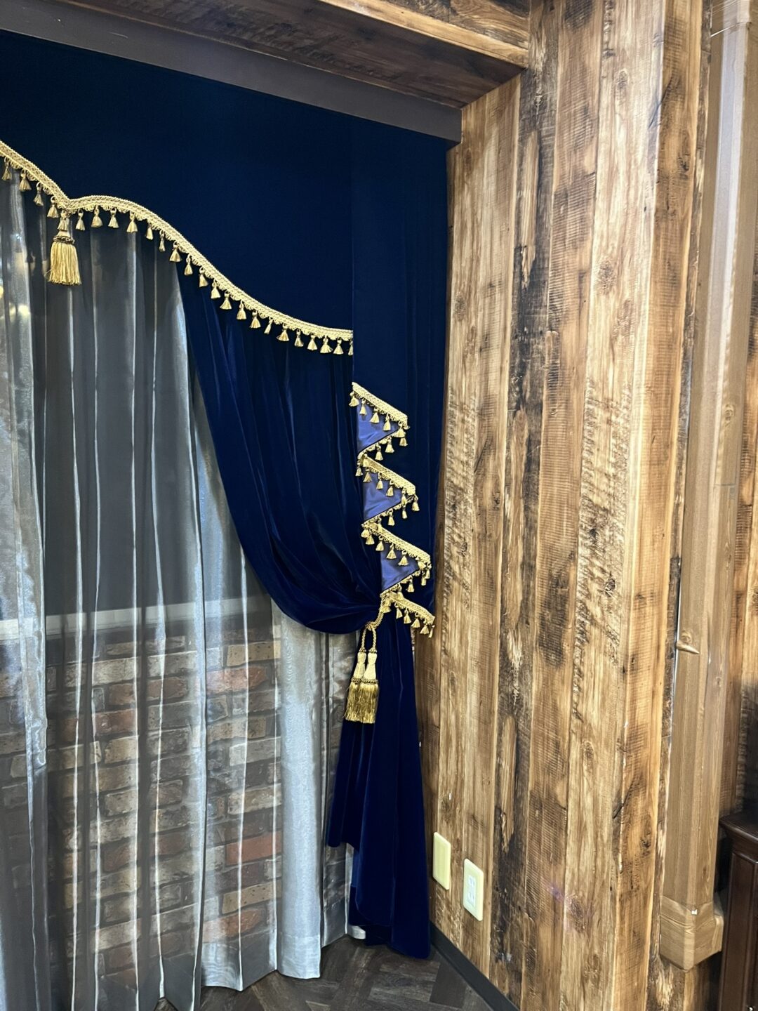 店舗のブランドコンセプトに伴い、ダークネイビーカラーのバランス付カーテンでベロアかサテンを想定。