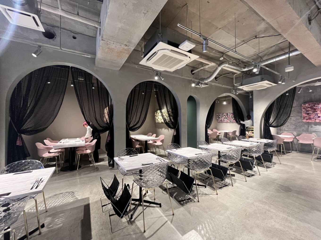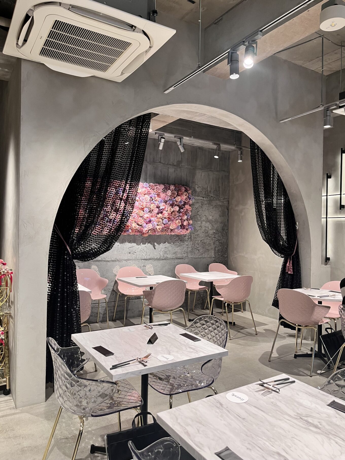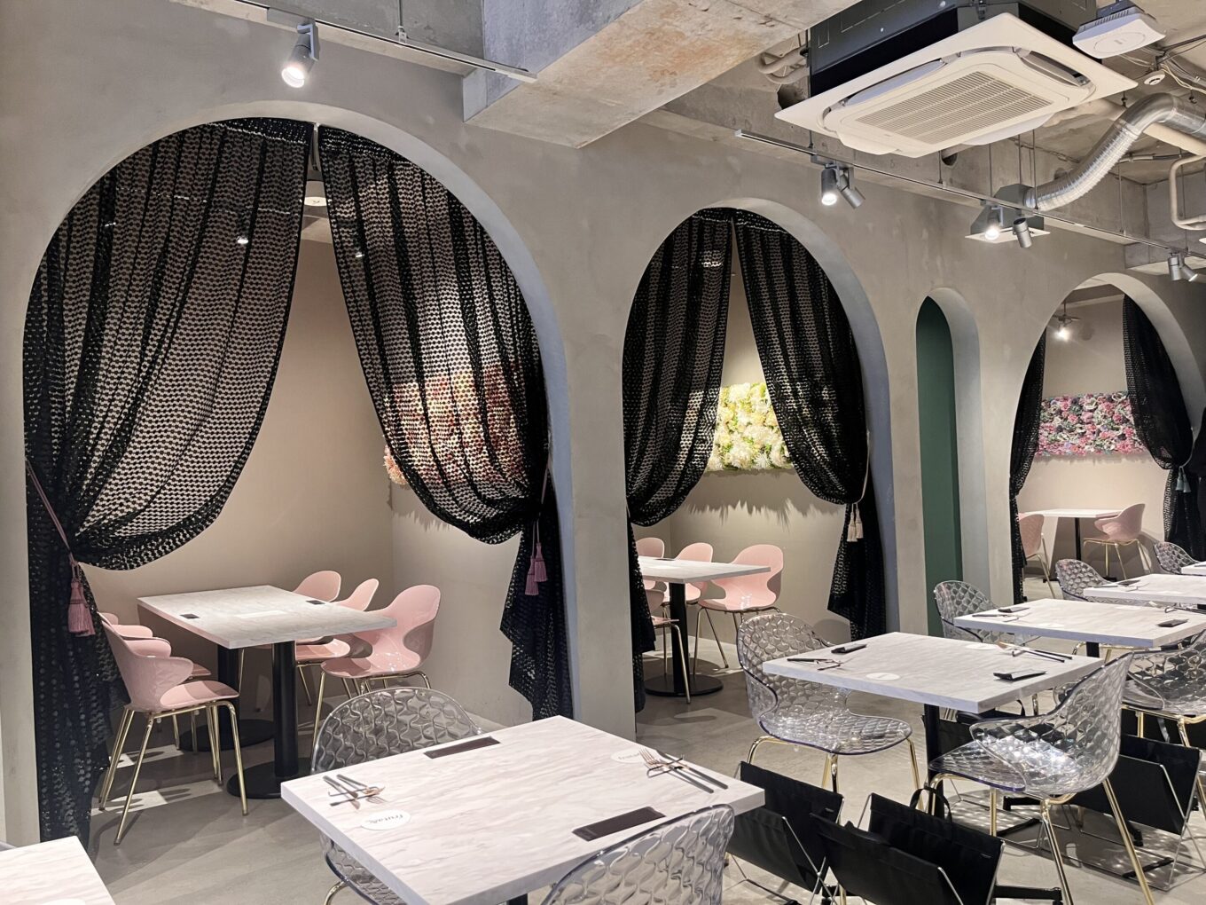 【店舗施工事例】表参道の人気カフェ! 昼は”かわいい”、夜は”大人” 空間演出にオーダーカーテンを