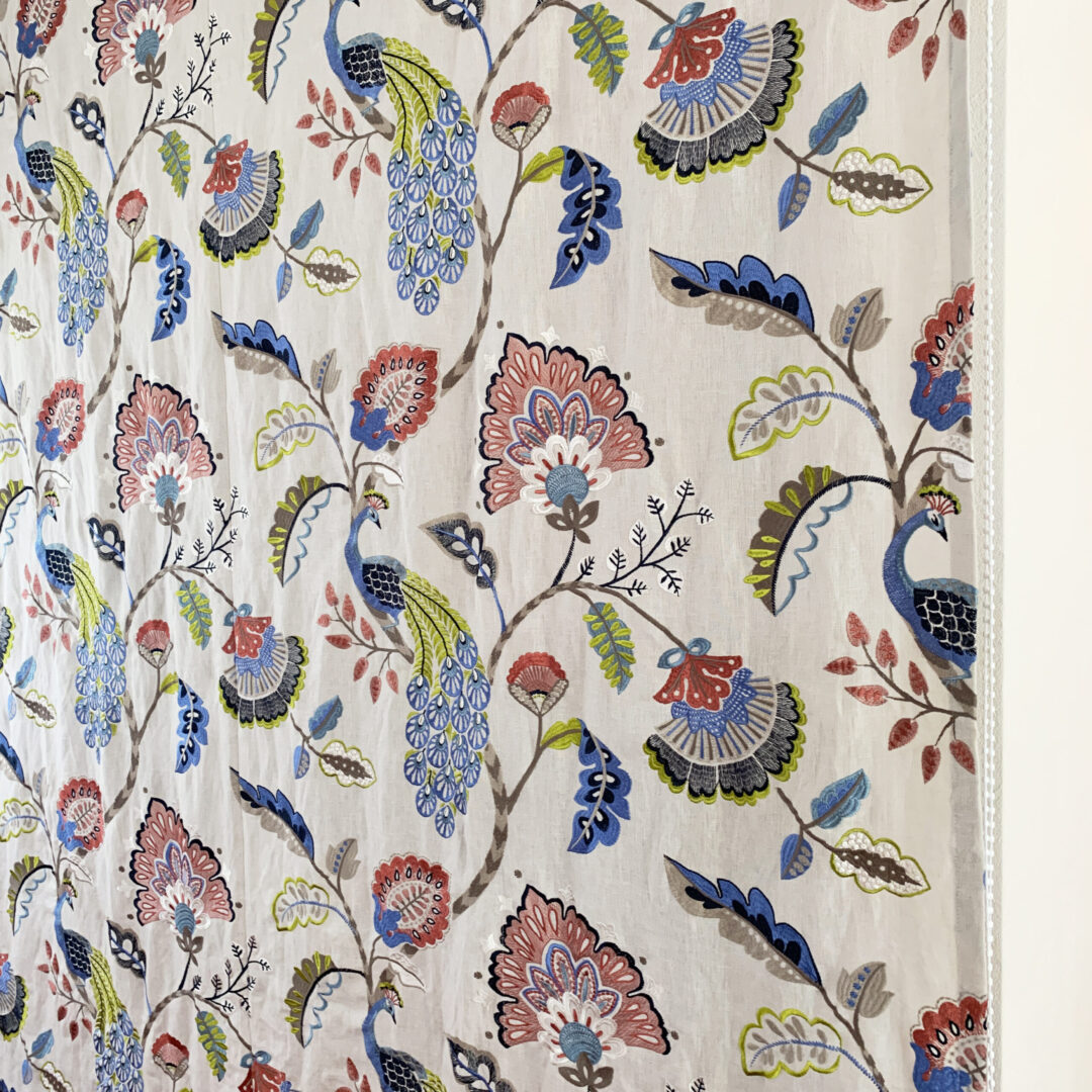 ミッソーニのソファのお色味に併せて使った生地はロンドンを拠点とする ブランド、Jane Churchillの青いクジャクの刺繍が美しいjaipurPeacock!