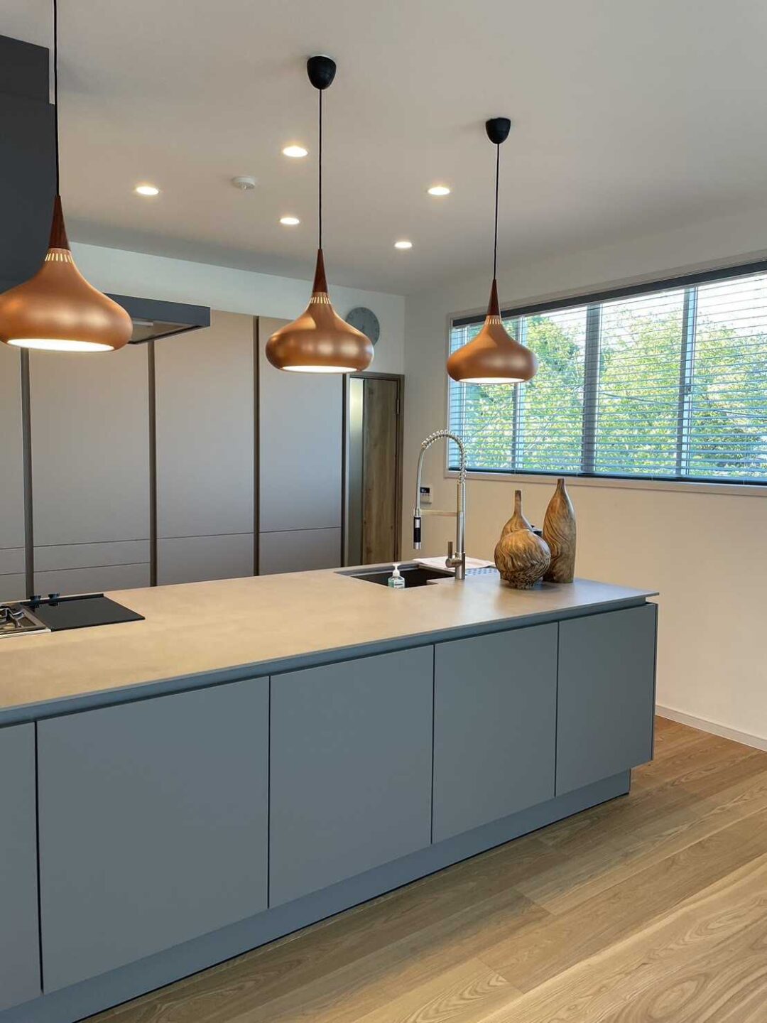キッチン横にはナニックのプレミアムシリーズのウッドブラインドをお選びいただきました。